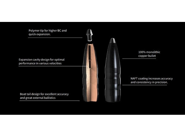 - Boattail og polymer-spiss for maksimal presisjon og lav luftmotstand